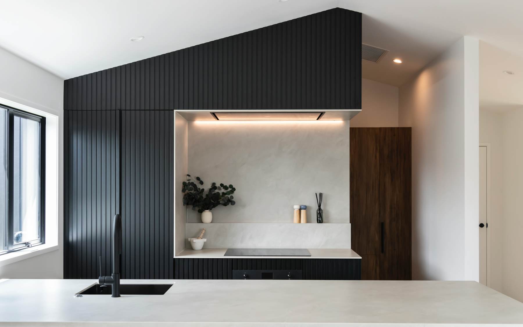 Dark vertical panelling extends from the pavilion-style exterior into the heart of the home, highlighting the kitchen’s centerpiece and continuing into the lounge with a high-arched feature wall that brings the space together.