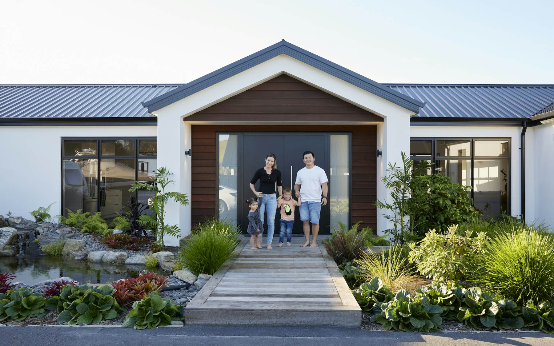 The mixed cladding of Celcrete in Resene Sea Fog and Cedar weatherboards in Dryden Oil Walnut gives a sleek finish and opulent vibe and the grand boardwalk leads into bright and airy open-plan living.