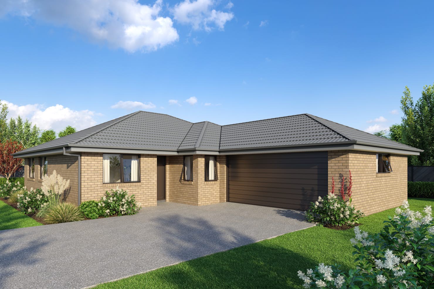The Kereru plan offers a perfect family home with four spacious bedrooms, open plan living, and a double car garage. Natural light fills the stylish yet functional kitchen through ample windows. The north-facing communal living areas maximise the section layout, with a generous patio area completing the indoor/outdoor living experience. This design offers great value without compromising on quality, and lends itself well to tailor-made changes, such as converting a bedroom into a second lounge.