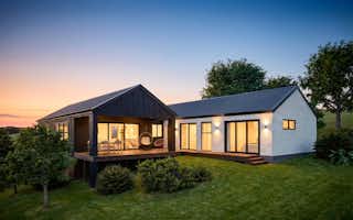 The home combines modern simplicity with functional living. A striking twin-gable roofline and natural materials create genuine street presence, while large windows fill the interior with light. Open-plan kitchen, living, and dining areas feature vaulted ceilings and extend to covered outdoor entertaining spaces, including a welcoming portico.