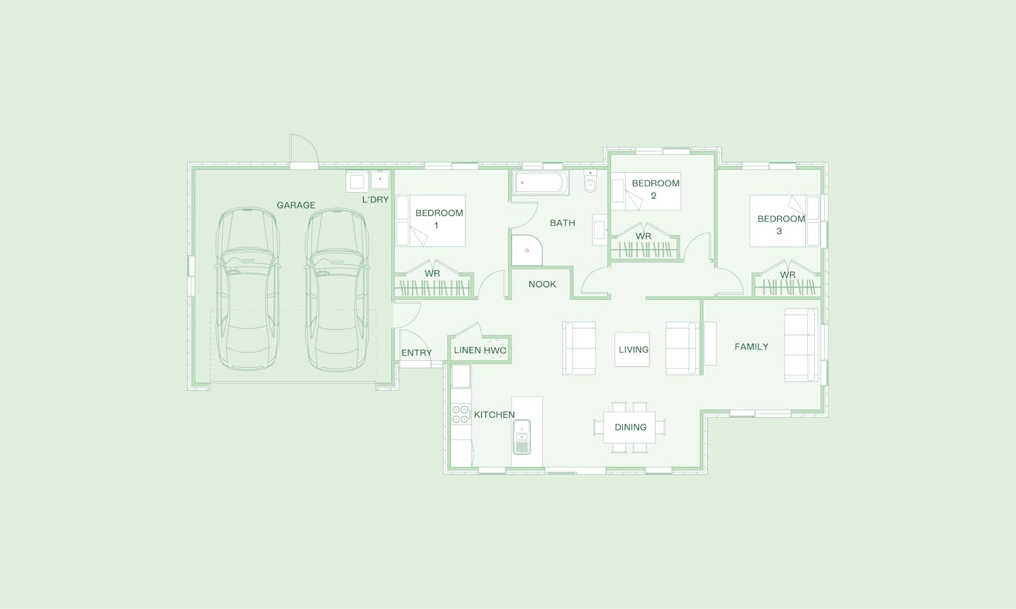 Our three-bedroom Taiko plan is a compact home with all the modern features. The cleverly designed floorplan allows for two double bedrooms, one single bedroom and expansive, light-filled living spaces.
