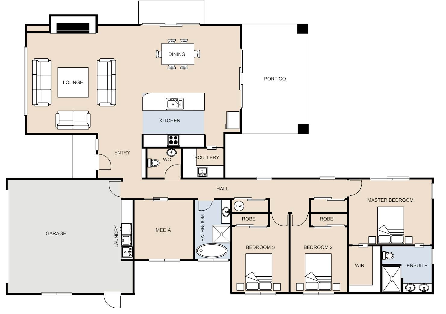 The Hugo Plan makes living easy, with four generous bedrooms, including a private master suite complete with walk-in wardrobe and ensuite. At the heart of the home, the open-plan kitchen, dining, and living area is filled with natural light and opens seamlessly to the outdoors – perfect for summer entertaining. A second living room adds flexibility, whether you want a media room, formal lounge, or quiet retreat.