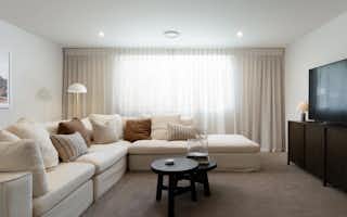 This stunning three-bedroom home is thoughtfully crafted with a modern layout that seamlessly separates social areas from private retreats. Organic materials, including a mix of dark and light materials, bring warmth and texture to the interiors, while a neutral colour palette enhances the home’s serene, earthy ambience.