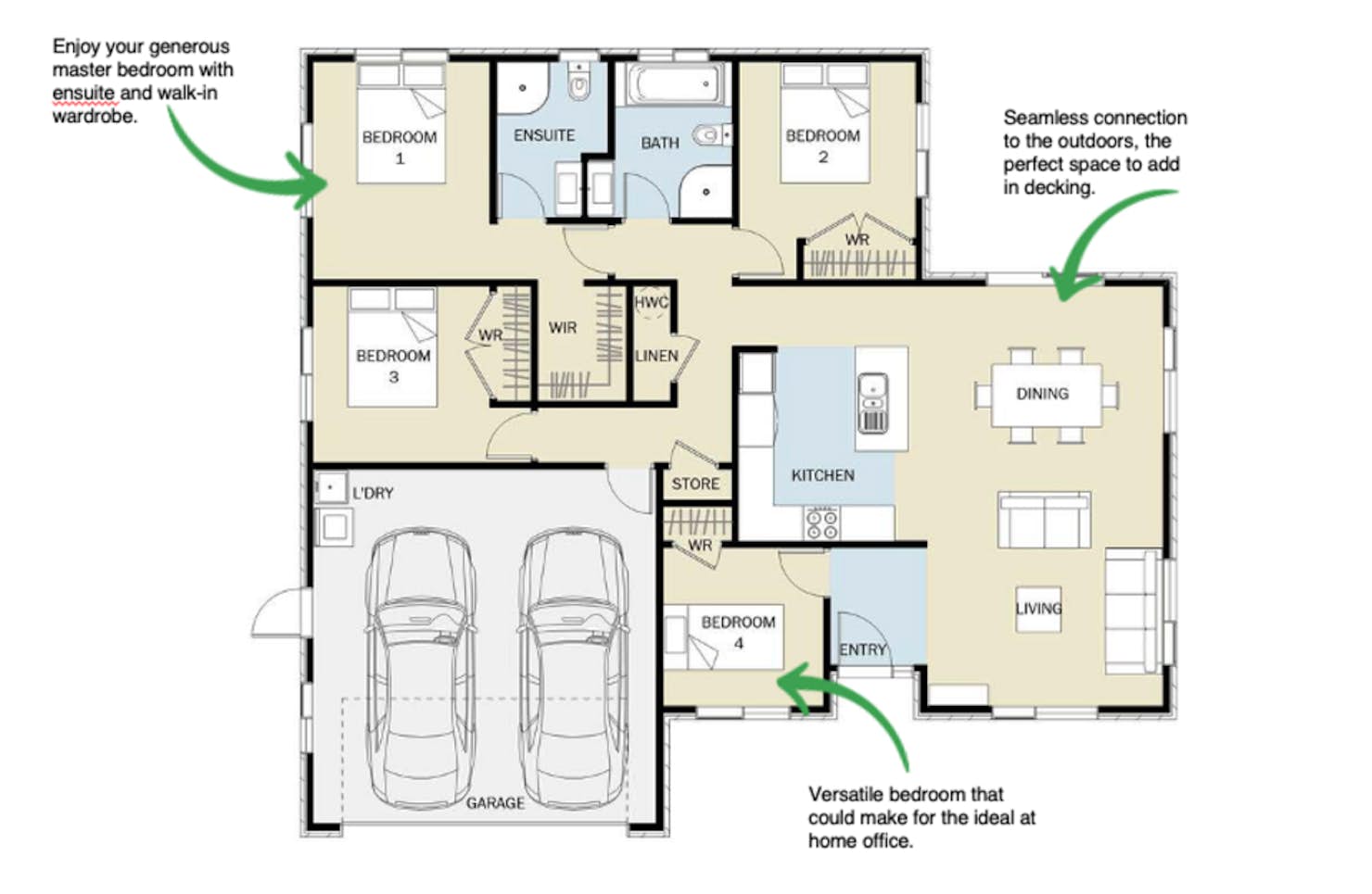 You are buying a Signature Homes House & Land package, with a north-facing aspect, 162m2 of internal living, 4 generous bedrooms with an ensuite in the master bedroom, 2 bathrooms, double car garaging on 526m2 of land.