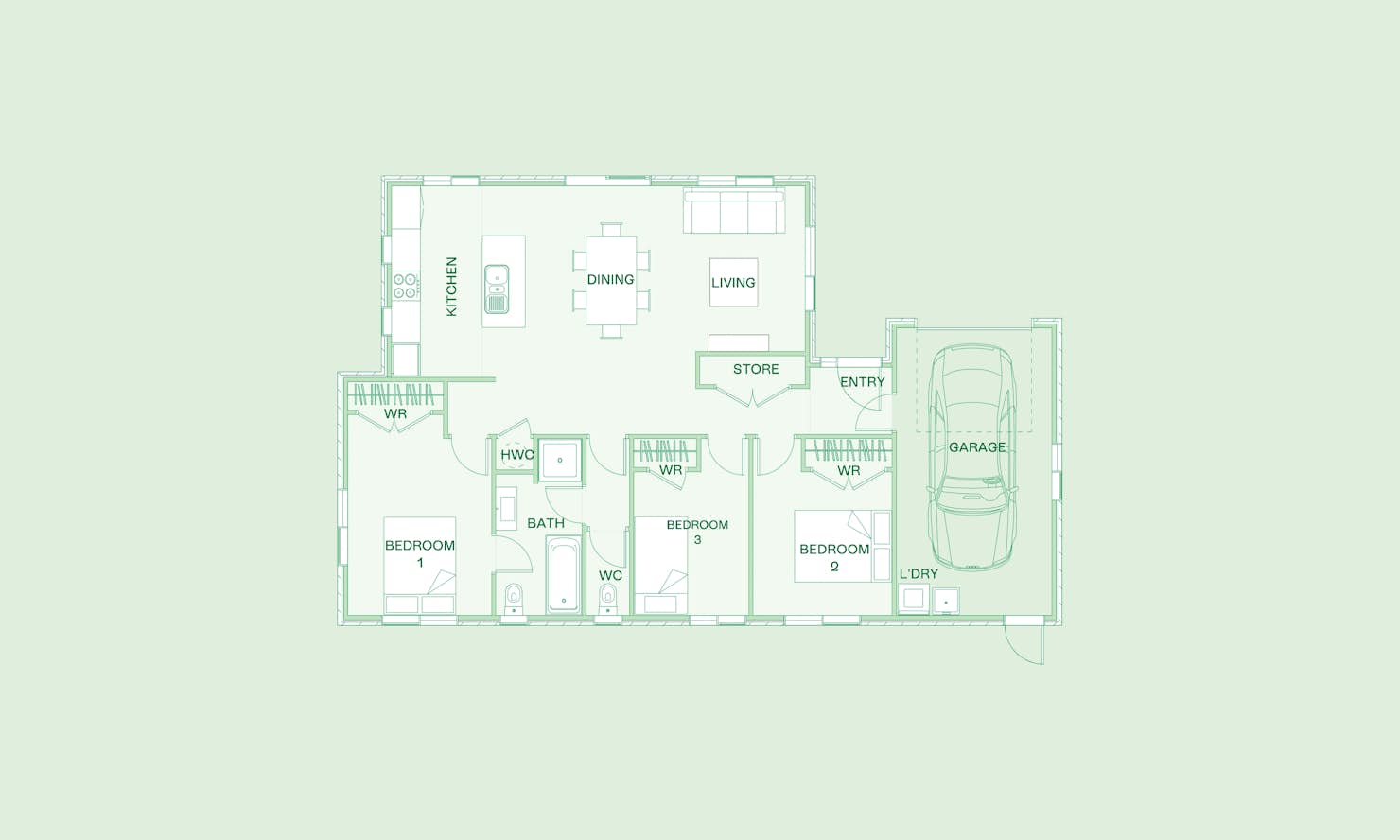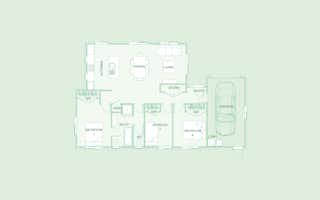 This modern three-bedroom home features open-plan living areas and three generously sized bedrooms, including a master bedroom with shared access to the bathroom. The smartly designed floor plan focuses on affordability without sacrificing quality.