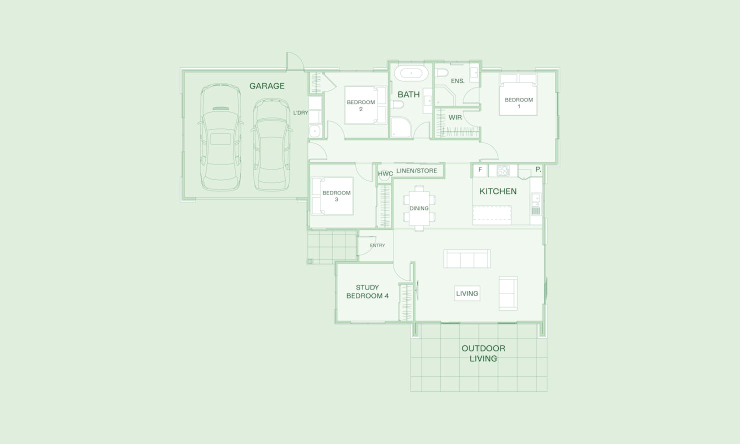 Discover comfort at its finest with the Wai plan. This design is a testament to efficient use of space, offering three strategically placed double bedrooms along with a convenient study/4th bedroom, an open-plan living area, and a double garage for all your storage needs.