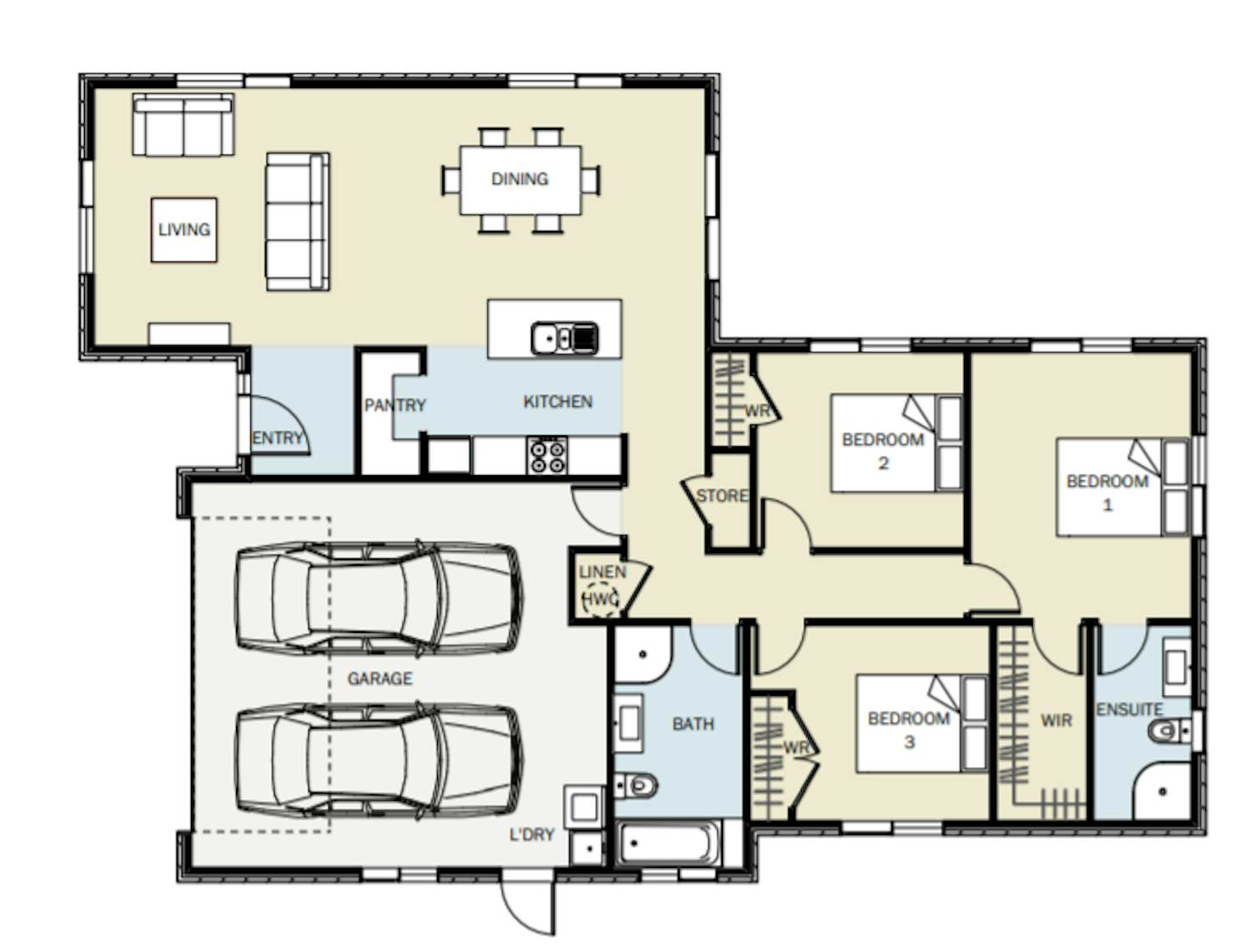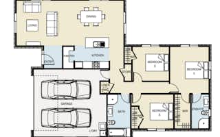 The Waxeye is a perfect home for the site, taking advantage of the north-facing aspect and offering superb rural views. This three-bedroom home includes an open-plan living and dining area, a kitchen with a pantry, an ensuite and walk-in wardrobe in the master bedroom, and a double garage.
