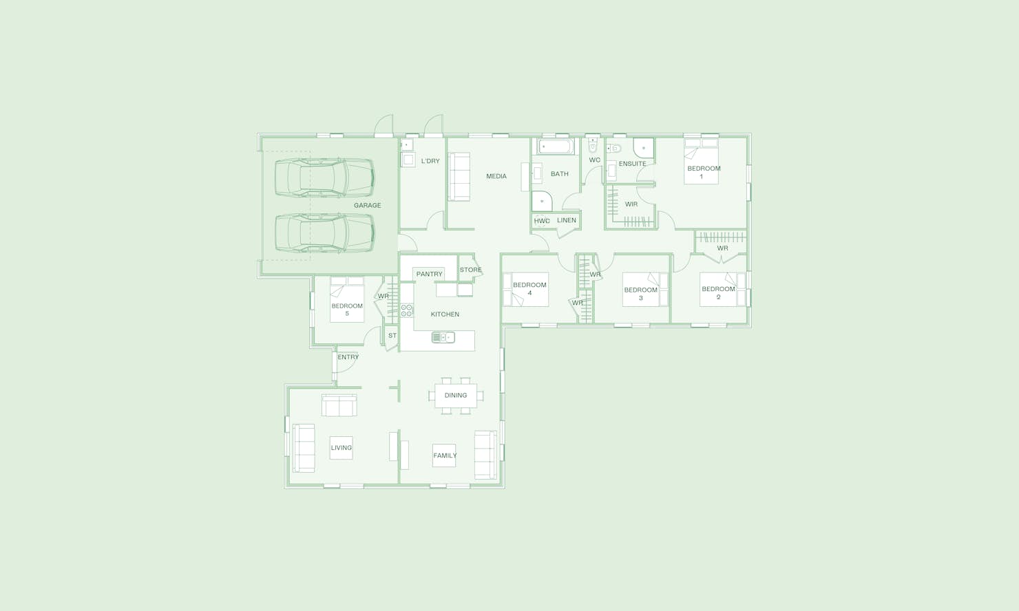 Our Harrier plan offers a large family home without the price tag. Featuring five generous bedrooms, three living spaces and a separate laundry, there's plenty of space for all to enjoy.