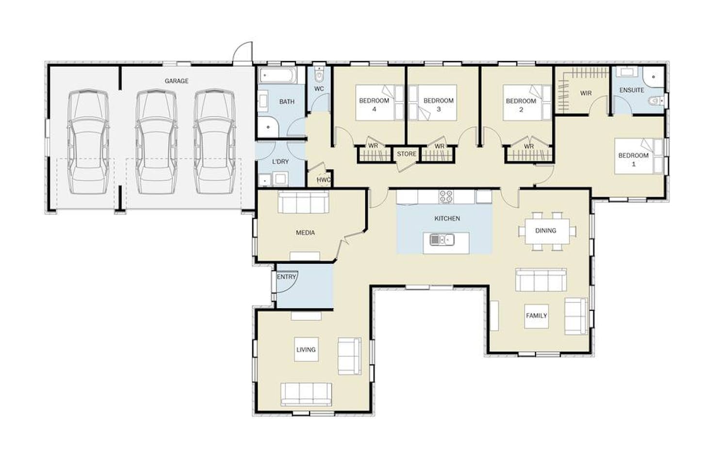 Upsize your lifestyle with the Matuku four-bedroom house design. The expansive layout makes for the ideal family and entertainers home. Take your pick from three different living spaces - great for families with kids. The kitchen is at the heart of the home, which looks out to the patio areas. Bedrooms are placed away from the living and dining spaces creating a retreat at the end of a long day.