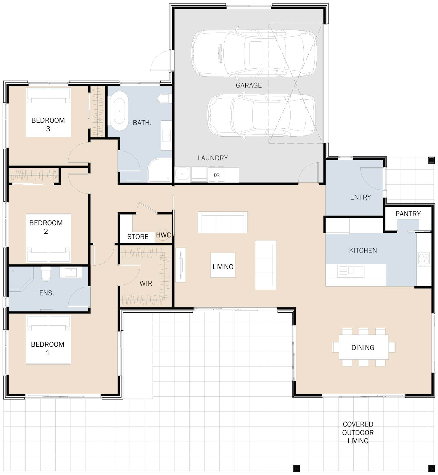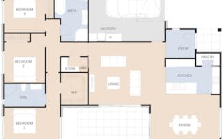 Simple, elegant and modern, the Manapouri was thoughtfully designed for family living with a stylish twist. The design features an inviting entryway that connects to a seamless flow of open-plan living space and a centralised modern kitchen that forms the hub of the home. The large sliders optimise an indoor/outdoor flow leading out to a stunning covered outdoor dining area - an entertainer's delight! The bedroom wing consists of three spacious double bedrooms and two bathrooms, including an ensuite.