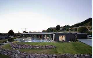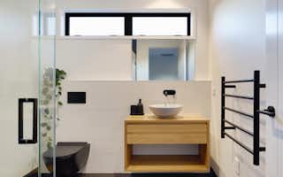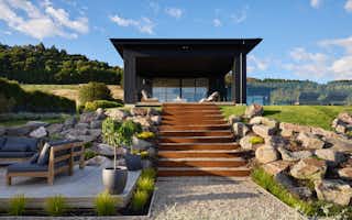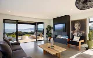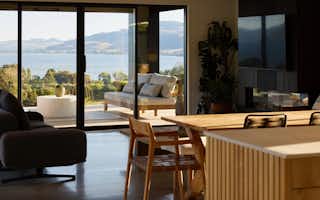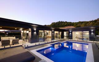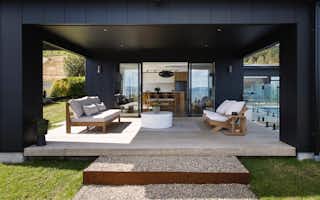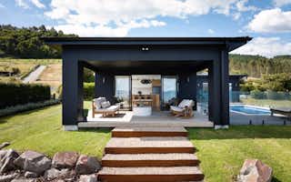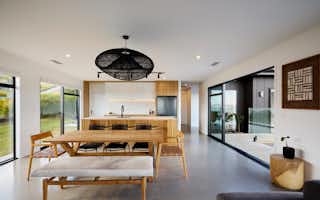 The Atkin home offers 214 square metres of modern living space, with 3 bedrooms, 2 bathrooms, and 2 living areas. Its clean lines, expansive windows, and seamless connection to the outdoors create a tranquil and stylish setting. Inside, the open floor plan, high ceilings, and natural light make it a welcoming space for relaxation and entertaining.
