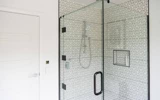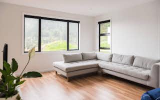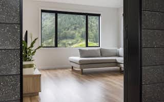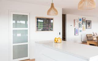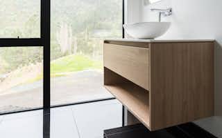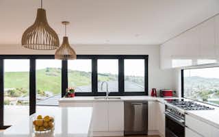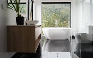 The bathrooms are decadent and indulgent escapes, particularly the master ensuite with its free-standing bath next to a full-height picture window. With a view to the bush-covered hill, the bath is an idyllic spot to luxuriate and de-stress. The black-and-white tiled walk-in shower is also a standout feature, ticking boxes for functionality as well as style.