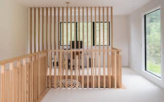 The modern feel of the house is amplified by the choice of architectural features. American ash stairs are framed by striking vertical timber. The onyx honed concrete-block feature walls add texture, contrast and wow factor to the entrance. The window seat in the open-plan living area is an inviting place to sit and read.