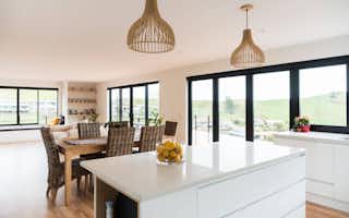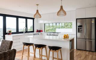 Vertical timber cladding is paired with James Hardie Axon Panels for a handsome exterior. A black garage door, guttering, lighting and black-framed glazing make for a crisp, contemporary finish. Outdoor connections are made through generous bi-fold doors to the deck and a servery from the kitchen, which opens to a bar leaner and seating for easy entertaining.