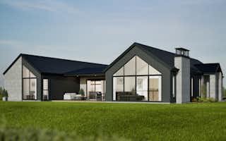The home’s contemporary design seamlessly blends modern elegance with rustic charm. Striking black and textured grey hues enhance the mixed-material cladding and architectural details, creating a bold yet inviting exterior.