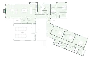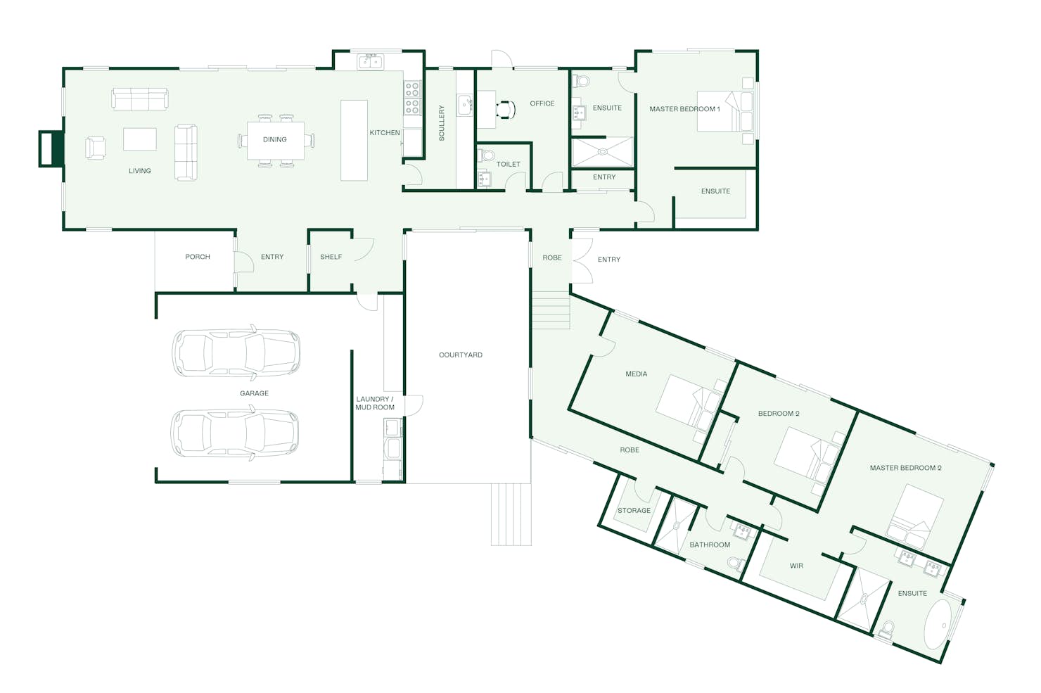 The 312sqm Brassknocker custom build features a modern geometric design and a thoughtfully crafted layout. It features a bedroom wing with three generously sized bedrooms, conveniently located bathrooms.