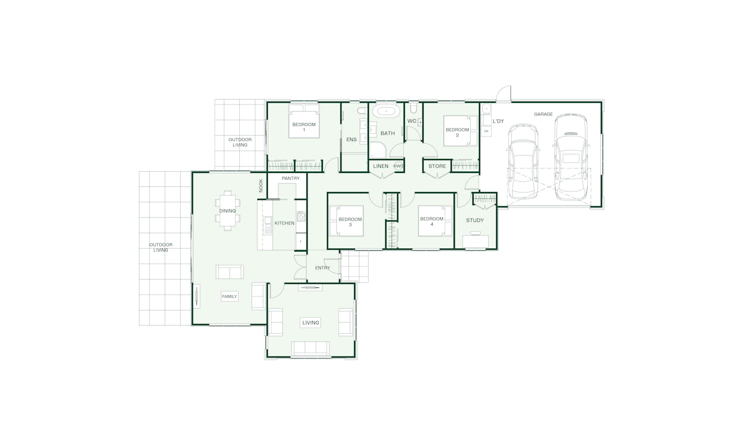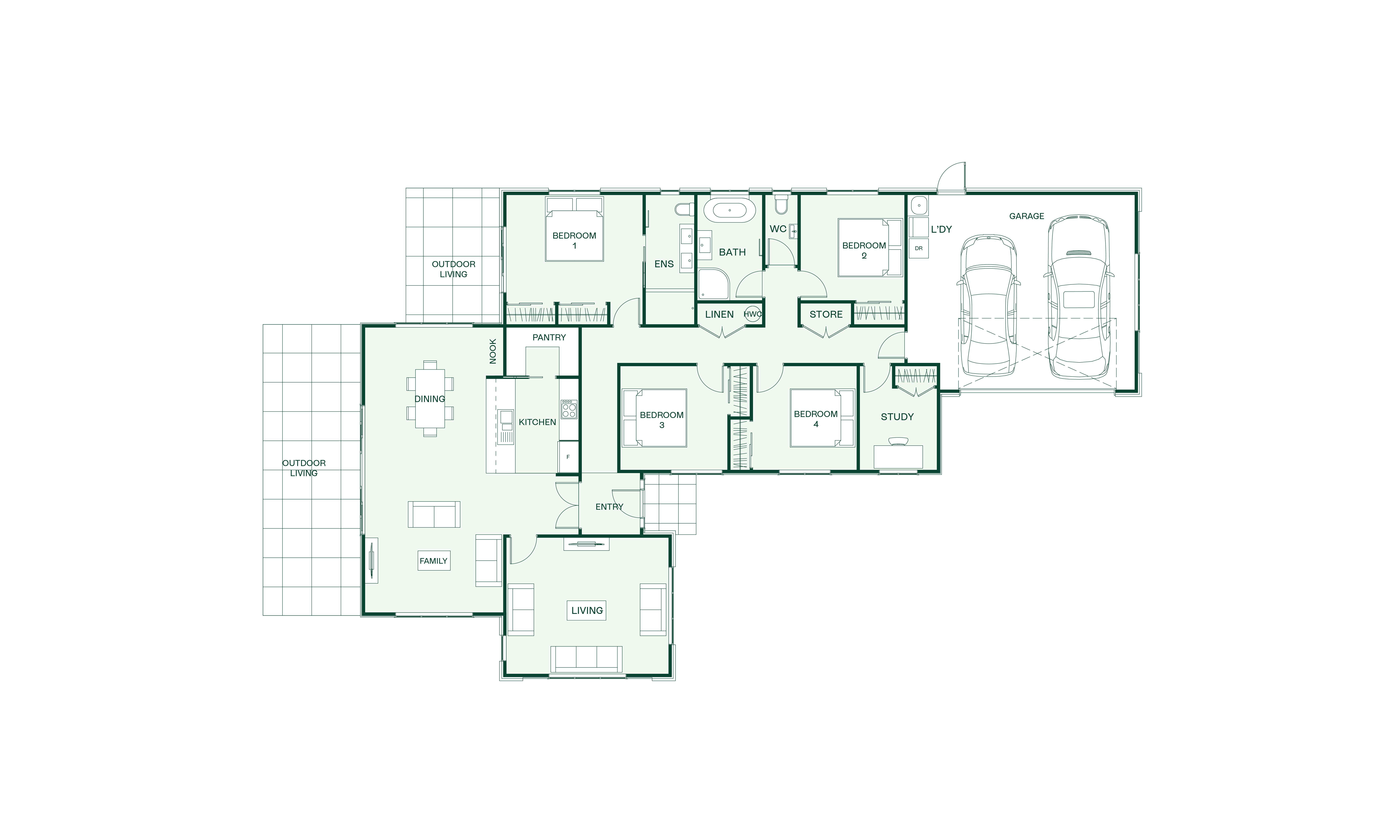A natural flow of movement cocoons the Caroline's peaceful bedroom zone from its bright, sociable living areas. All four bedrooms are stacked on one side of the home, encouraging foot traffic to flow between the three minor bedrooms and the utility zone of bathroom, linen closet and laundry.