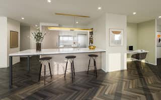 The design features considerate spaces for everyone to relax or entertain in, with the living area and family room separated by the hub of the house, the modern kitchen.
