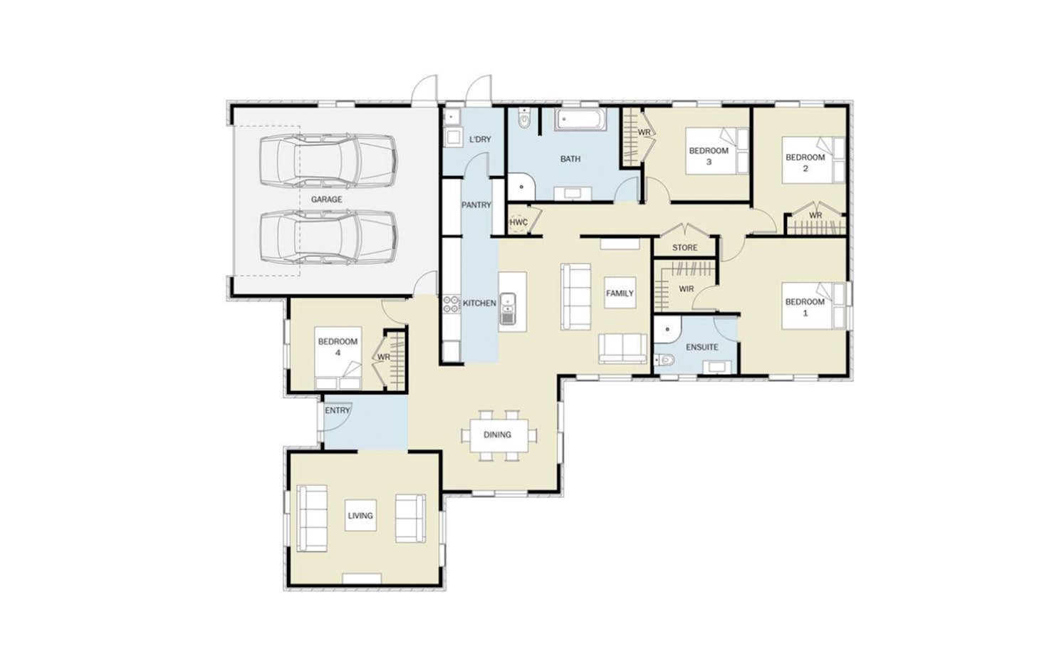 Our four-bedroom Kahu plan is a home of generous proportions, where spaces seamlessly connect. The fourth bedroom is positioned away from the other bedrooms, making it ideal for guests or teenagers.