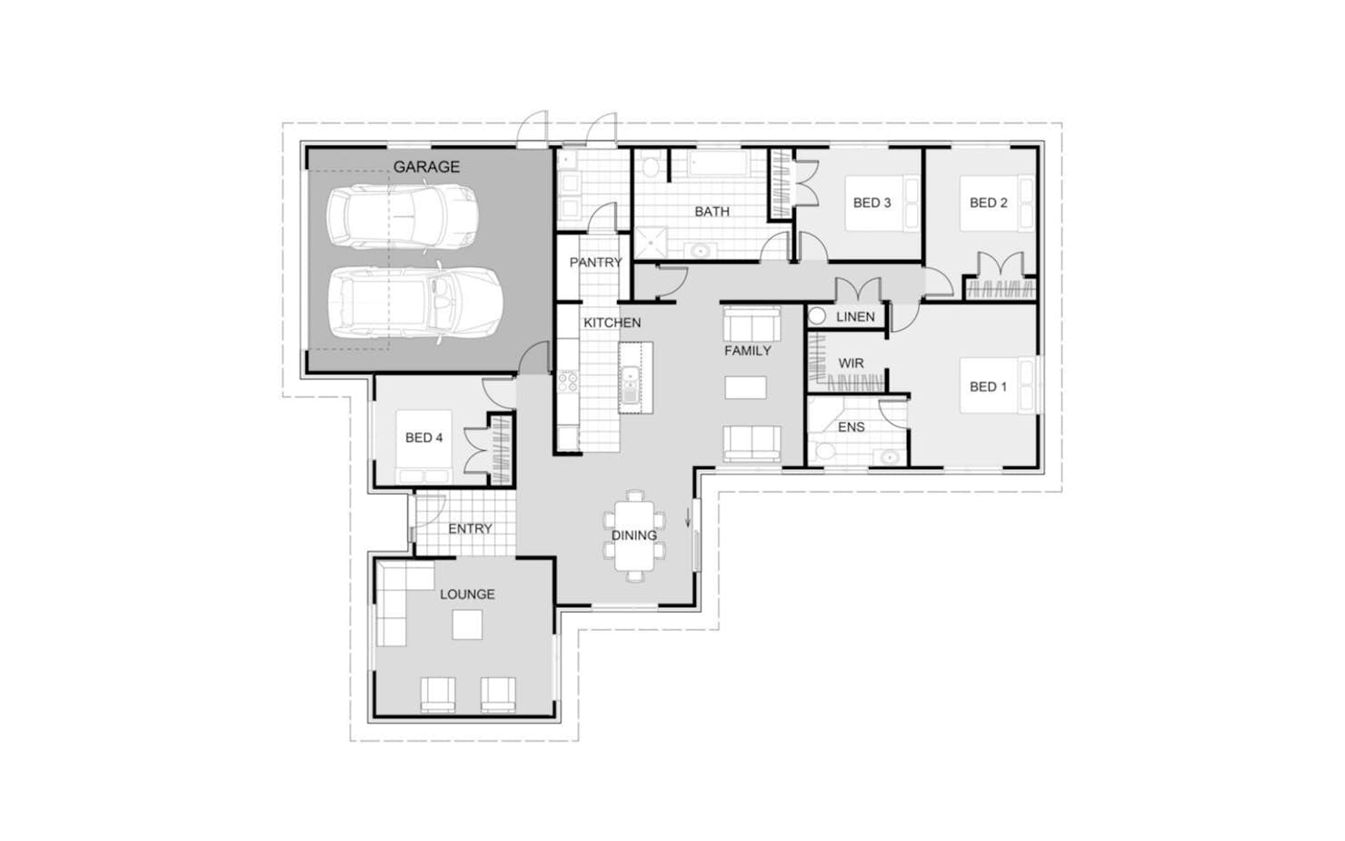 The four bedroom modified Kahu plan offers a modern layout that separates social spaces from private zones. Special features include a separate living area, and thoughtfully placed bedroom layout.
