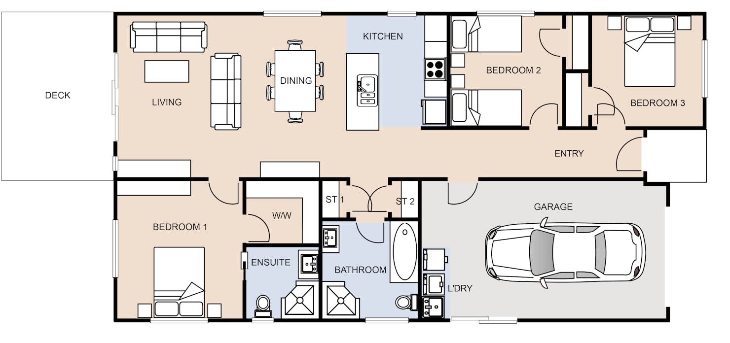 The Karaka house plan presents exceptional value and will appeal to those downsizing, but still want the extra space for friends and family to visit. Open-plan living sets the tone for this home, with a natural flow from the kitchen to the outdoor living space.
