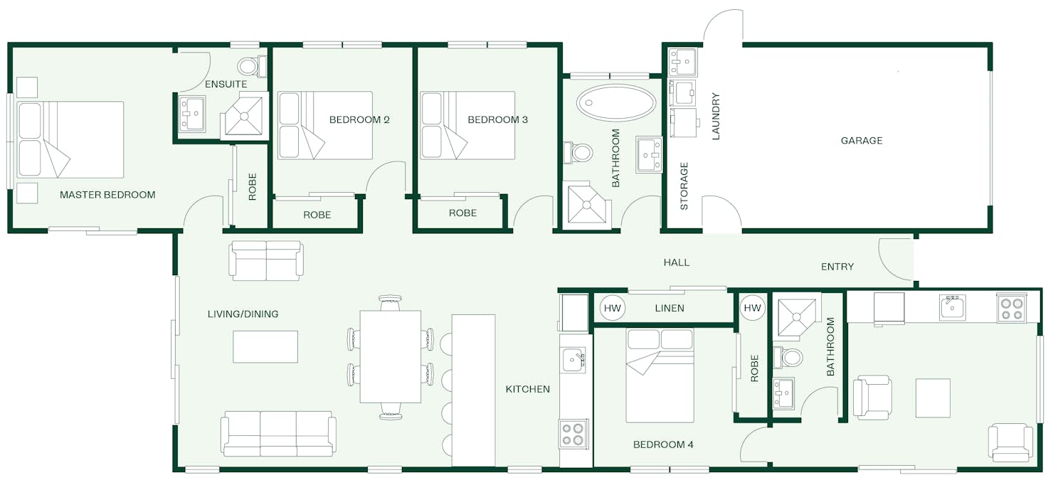 Meet 'Kawarau' a well-designed four-bedroom home offers the perfect blend of open-plan living and private retreats. With multiple bathrooms, a functional kitchen, and versatile spaces, it is ideal for families of various sizes.