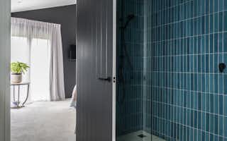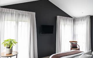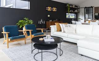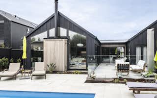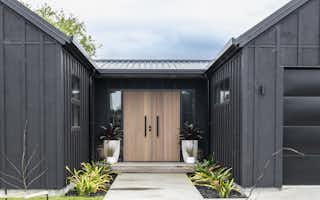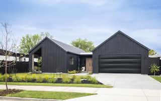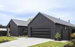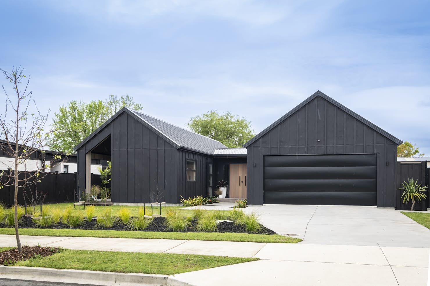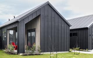 The captivating Kawau build, offering three double bedrooms, showcases a bold and contrasting exterior facade. The combination of cedar shiplap weatherboard and shadowclad textured plywood cladding, accented in Resene All Black, creates a visually stunning composition that instantly captures attention.