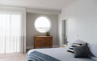The porthole window in this two-storey Design & Build home is a nod to the coastal location. As well as accommodating the sloping site, the four-bedroom, two-storey home maximises sea views.