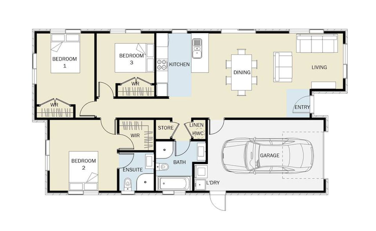The three-bedroom Kingfisher plan offers low maintenance living and easy to navigate layout where the open plan living creates a lovely light-filled home that connects to the outdoors. The master bedroom features an ensuite and walk-in wardrobe. Each bedroom is generous in size, making the Kingfisher an ideal family home.