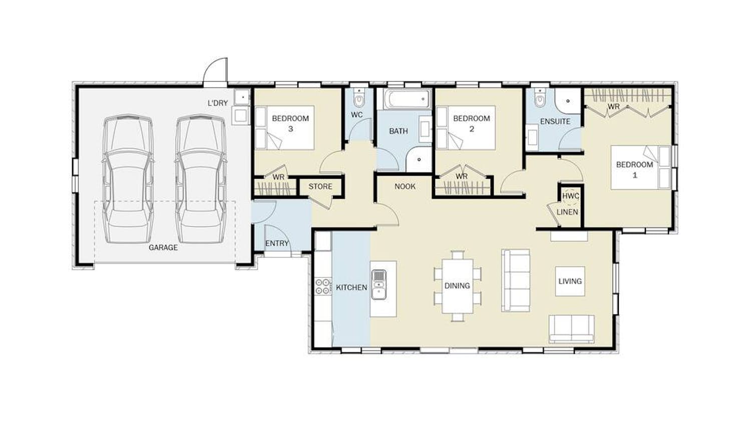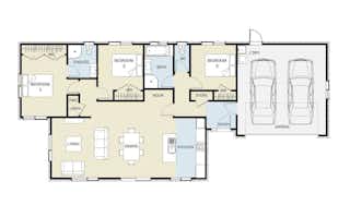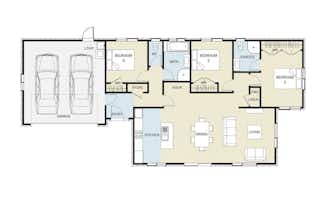 The Kiwi plan makes for an ideal family home with three generous bedrooms, open plan living and double car garaging. Daylight shines through to the modern kitchen thanks to ample windows - add some flair to your home with a glass window splashback.