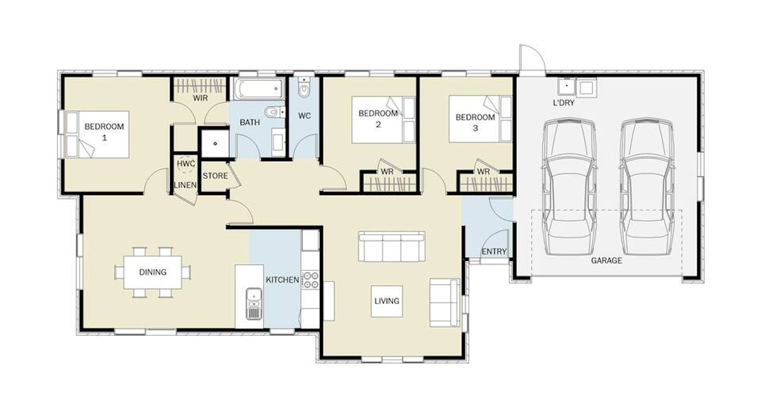 Our three-bedroom Kuaka plan is a cosy home that will become your sanctuary to come home to. Make the living room a restful space where you can retreat to at the end of the day. Enjoy open plan living in the kitchen and dining space which effortlessly connects to the outdoors.