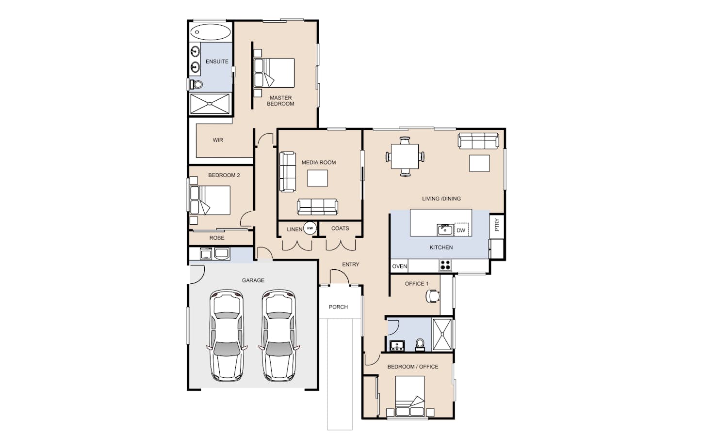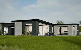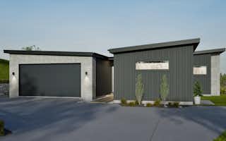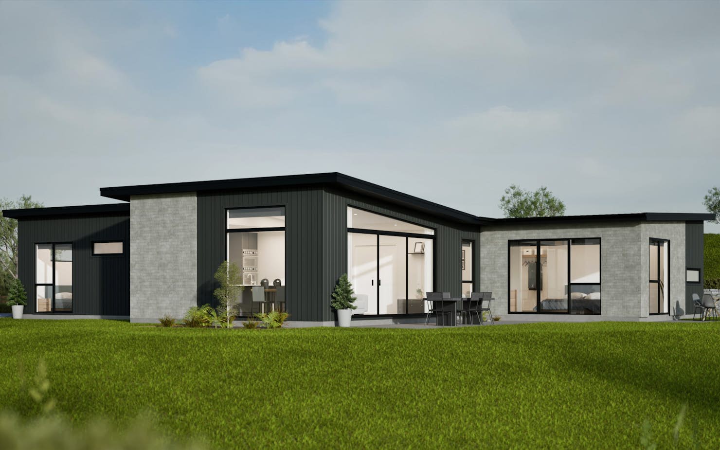 This 199sqm Luggate home is a modern family haven offering 3 bedrooms, 2 bathrooms, 2 living areas, and a dedicated office. The home's striking exterior with its dark cladding and textured brick finishes creates a strong presence.