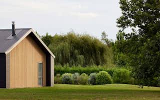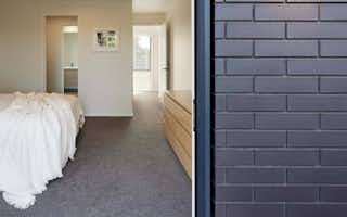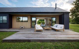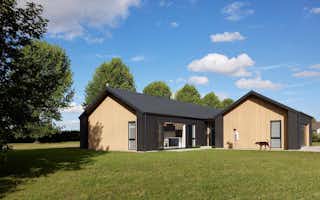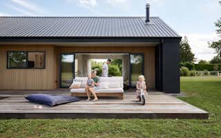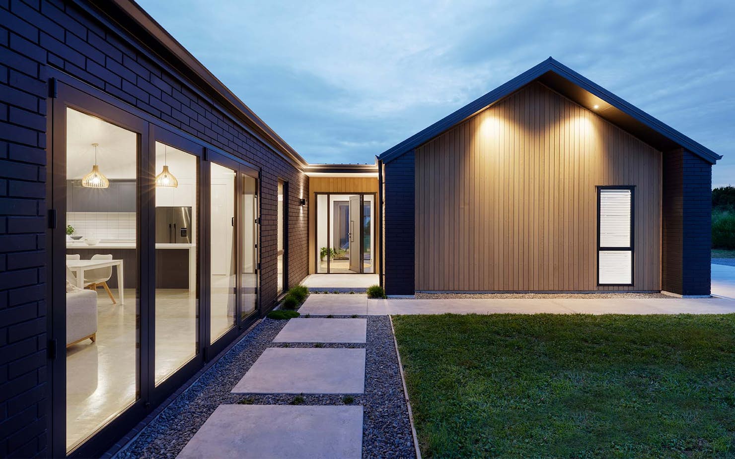 Dramatic dark brick makes up most of the home's exterior, with the addition of vertical shiplap cedar to the gabled ends, entrance, and covered areas to provide contrast.