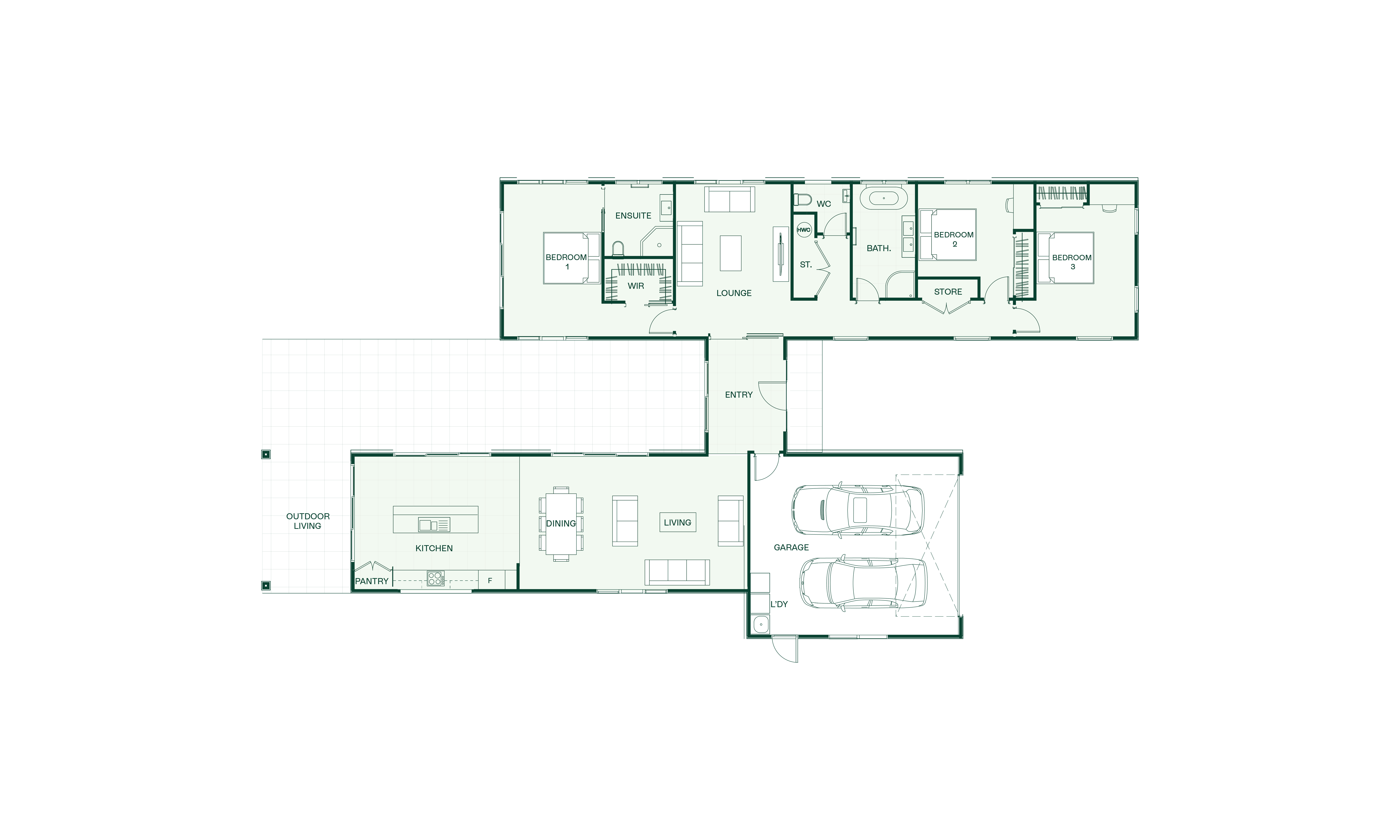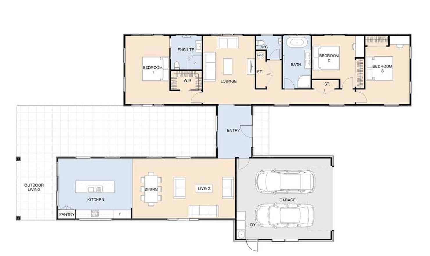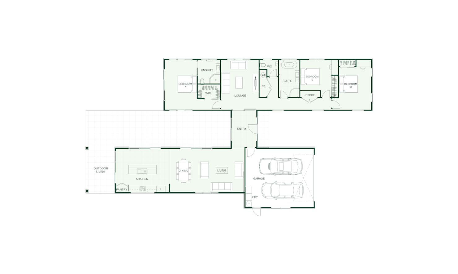 The H-shaped Medlands is an ideal design for young families. Once through the front door, a right turn takes you into the hallway, which leads to two bedrooms, a family bathroom, master bedroom with ensuite and walk-in wardrobe and a second lounge. Turn left and the open-plan social areas unfold.