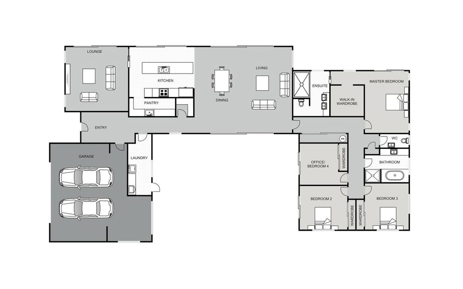 Continue down the hallway and you will be greeted by four double bedrooms, including a master suite with a large walk-in wardrobe and double-basin vanity in the ensuite. All remaining bedrooms have large wardrobes and easy access to the family bathroom.