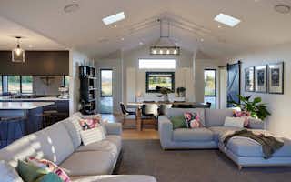 The relaxed country feel is bought to life with a modern country style kitchen and window seat, Barn doors, and Hardie Grove- soffit-lining on the entry, kitchen, dining and living areas ceiling.