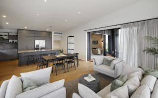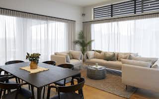 Finished with inviting and natural tones, the interior design complements the surrounding landscape with its feature wallpaper, engineered timber flooring, fully tiled bathrooms and an ensuite with bi-fold windows opening to a private garden, creating a lovely oasis.