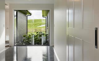 As you walk through the front door, you're welcomed by a wide hallway, with feature glass windows framing the garden and adding a natural element to the home.
