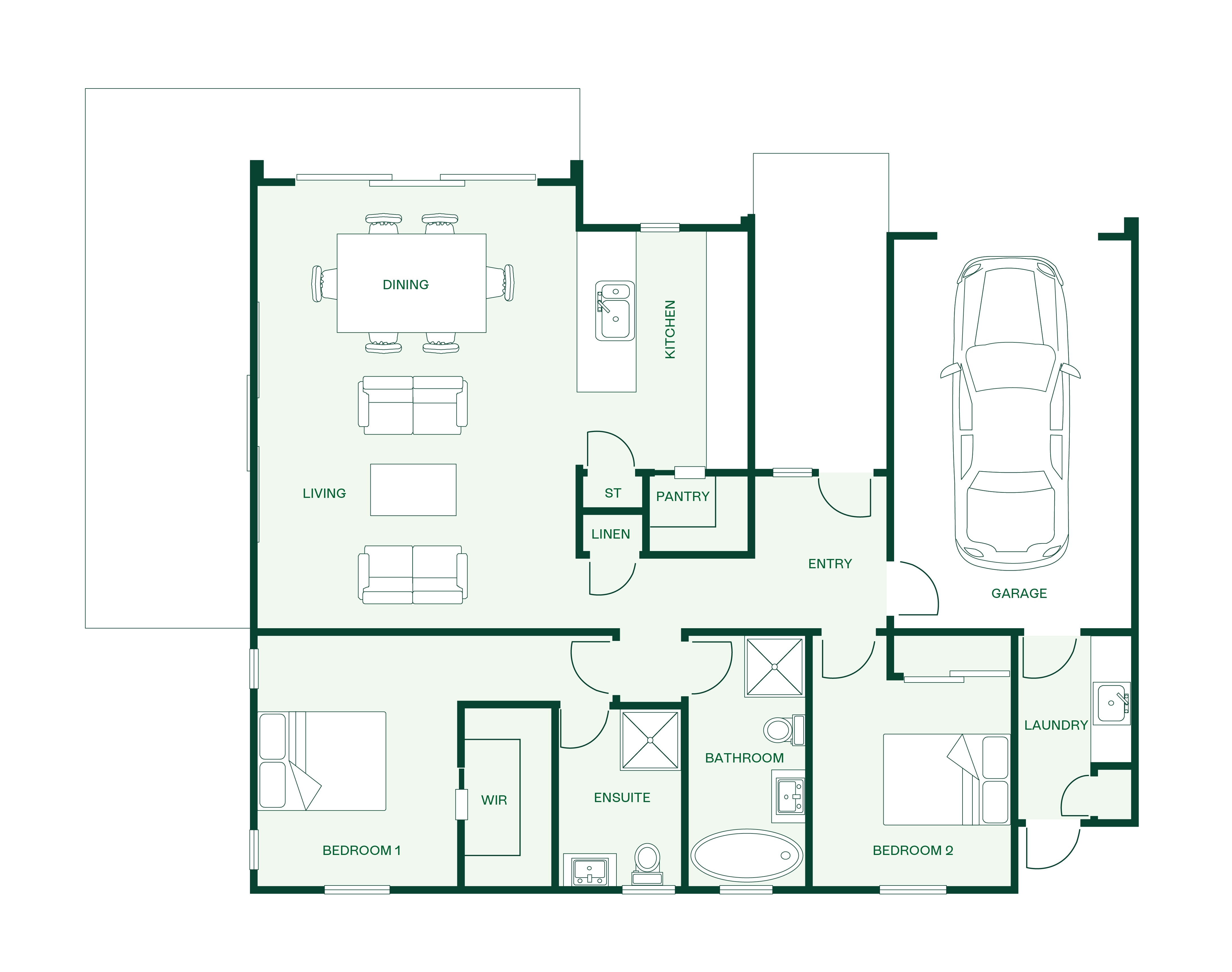 The Perriam house plan is ideal for entertaining, with the large, open plan living, kitchen & dining area that gets all-day sun. The two bedroom home is ideal for those wanting to downsize & have a low maintenance home.