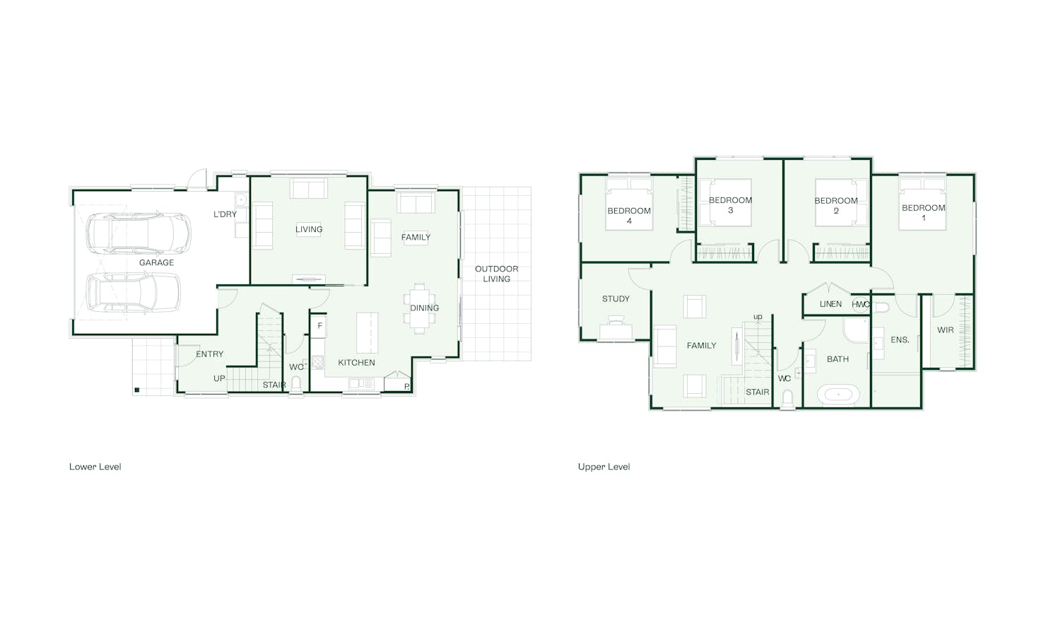 The two-storey Rakino gives your whole family room to work, rest and play. Downstairs is the social hub with open-plan living and dining that flows outside with ease, a second living area, and powder room.