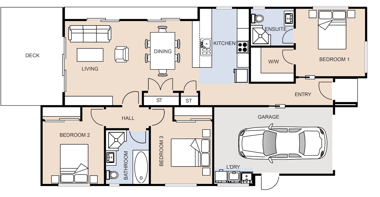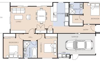 The Rimu house plan is ideal for families, the perfect fusion of style and functionality. Providing three generously sized bedrooms, the master bedroom features a large walk-in robe and ensuite. The open kitchen, living and dining space allow for an abundance of natural light with easy access to the outdoors.