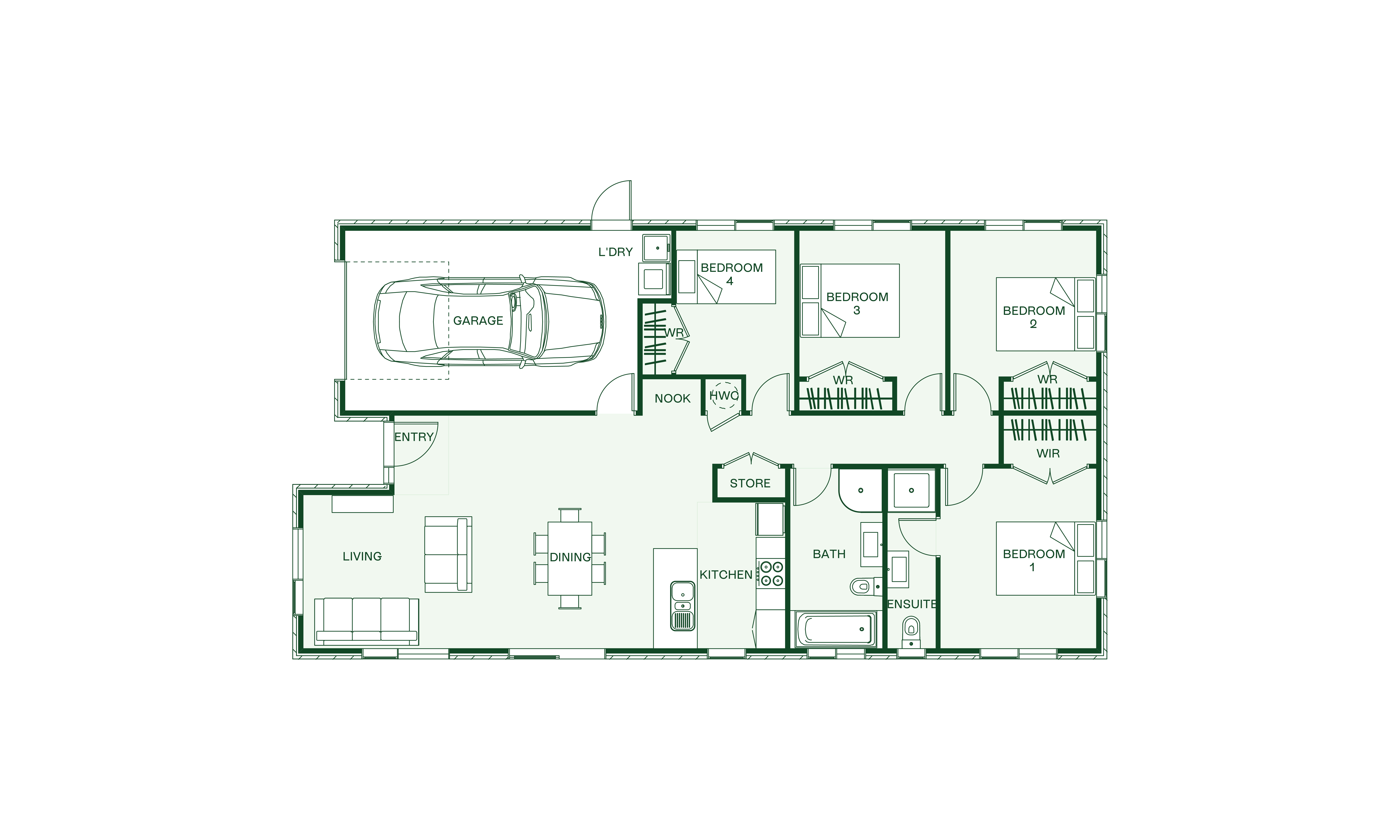 The four-bedroom Snipe plan makes great use of space at every turn. Open plan living helps to create more space throughout the home, allowing for bonus areas such as a study nook. Extra features include a generous family bathroom and a large master bedroom.