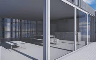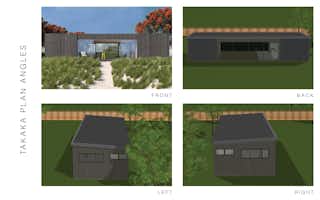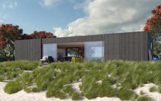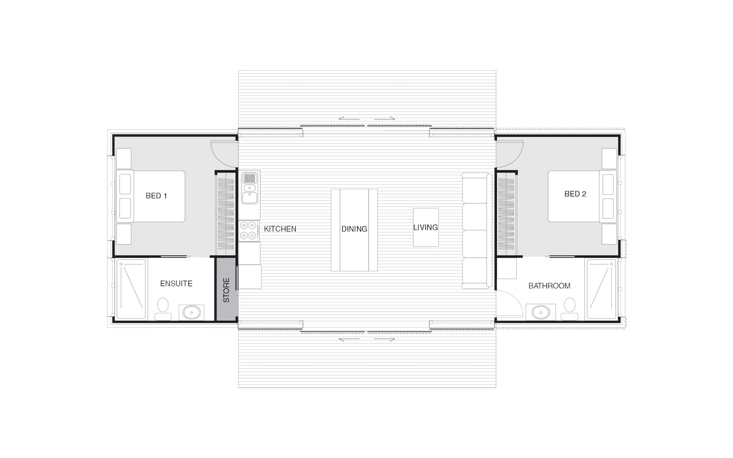 Clever and compact, this 97sqm mono-pitch design features a central open-plan kitchen, living and dining space which flows seamlessly via large glazed sliders to decks on both sides. Two double bedrooms, each with an ensuite, neatly bookend the home.