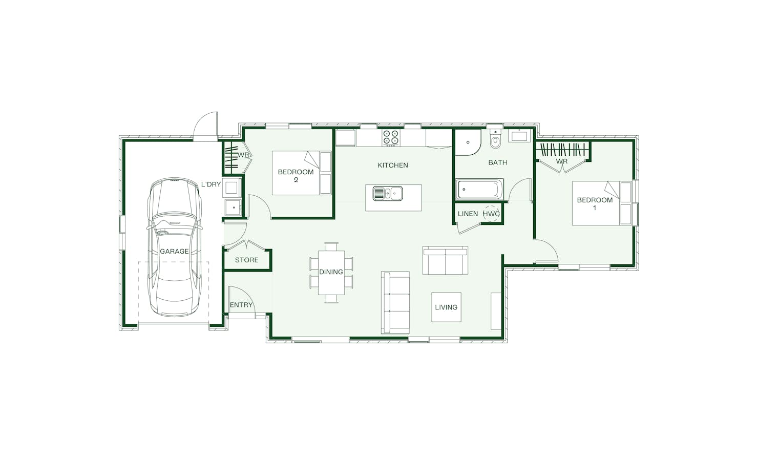 Good things come in small packages, and the Tui does not disappoint. This plan features two spacious double bedrooms, an open-plan kitchen, living and dining area and a single internal access garage, all in 116m2.