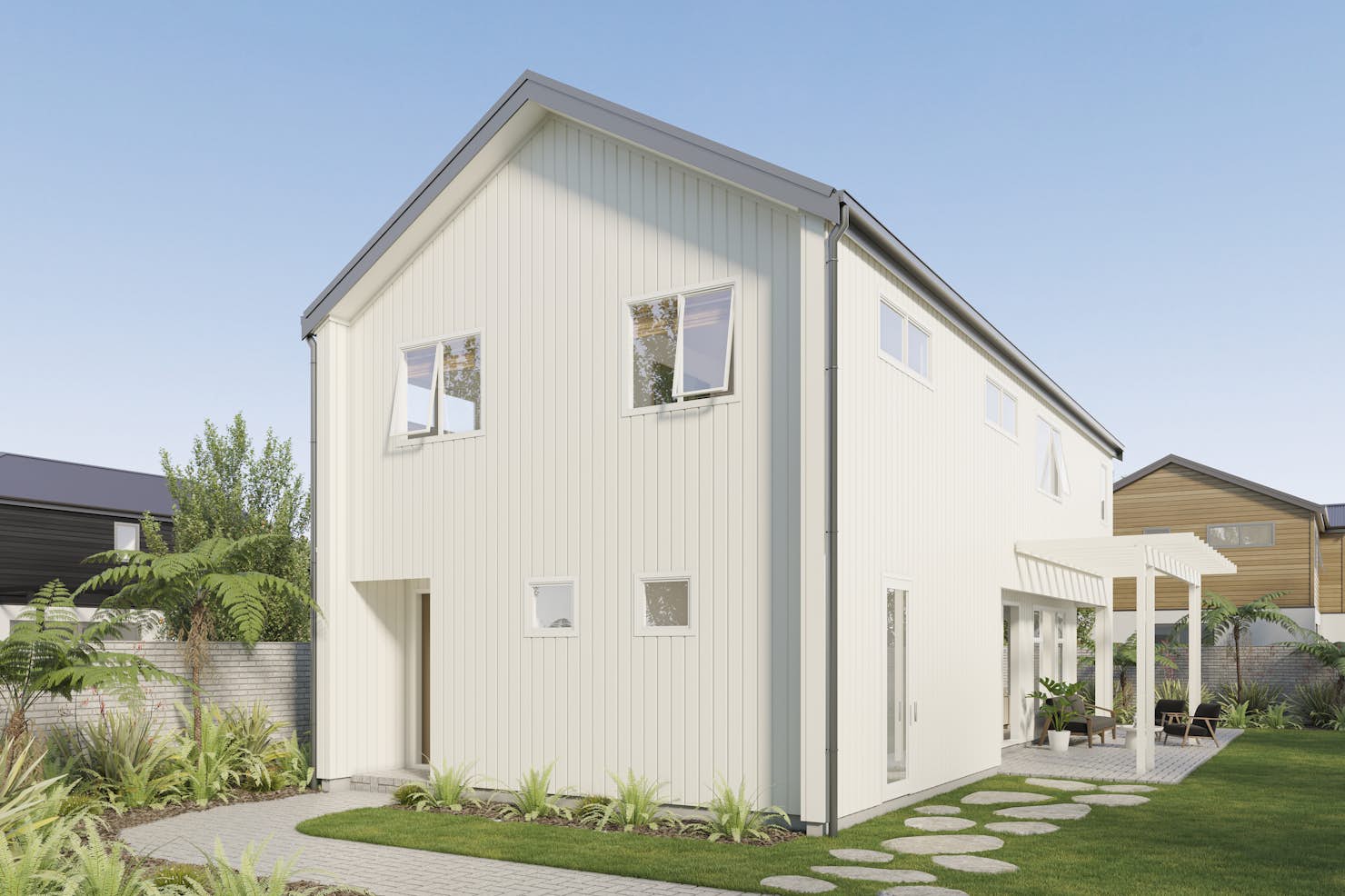 The light-filled Waimanu offers a stylish and cleverly designed family home. The open-plan ground floor allows for everyone to come together and also enjoy their own space, in the many spaces.