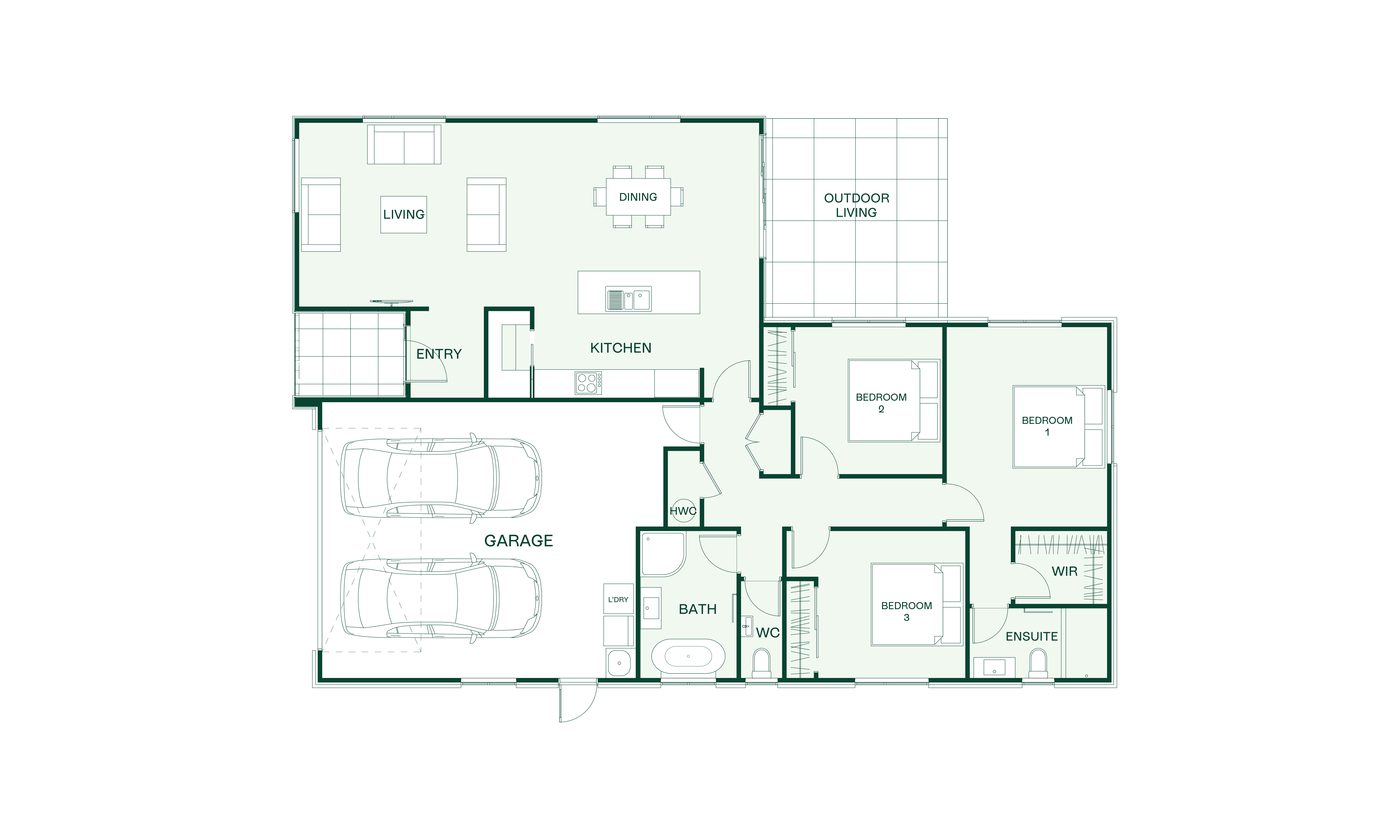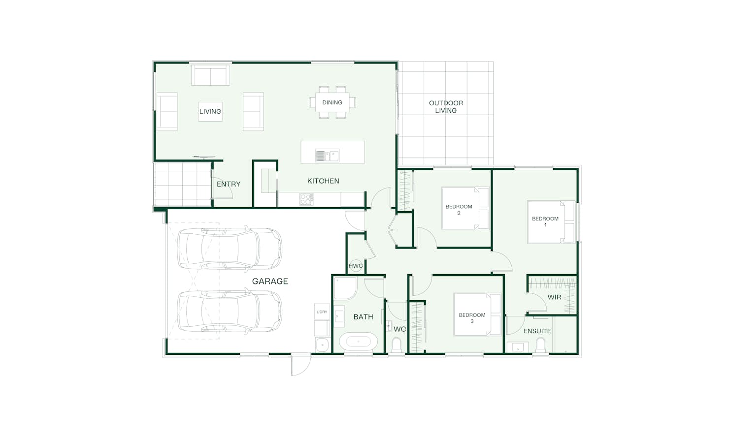 The plan also features two more double bedrooms, two bathrooms including an ensuite and a spacious open-plan living area accessed direct from the entryway.