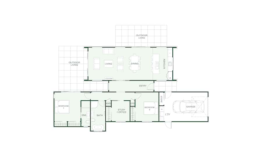 Cute as a button and versatile in many ways, our two-bedroom Mynah plan is a great way to add a minor dwelling to your residential site because the design falls under the 65m2 size regulation.
