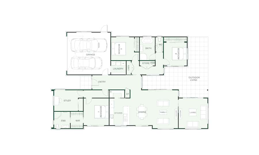 Our Fernbird plan offers an ideal family home or investment build. You will find a bedroom ideal for guests or teenagers at the entrance, with the remaining three bedrooms tucked away at the back of the home.