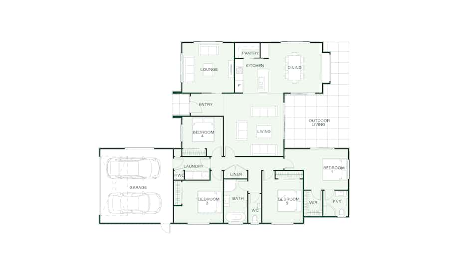 Our Fernbird plan offers an ideal family home or investment build. You will find a bedroom ideal for guests or teenagers at the entrance, with the remaining three bedrooms tucked away at the back of the home.