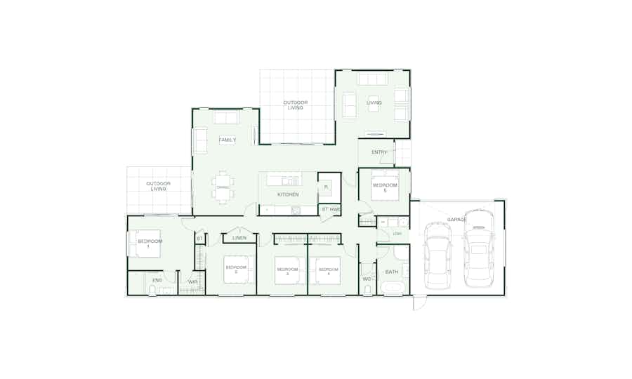 The Tangaroa house plan provides plenty of space for growing families. Featuring five bedrooms and two living areas at either end of the home.